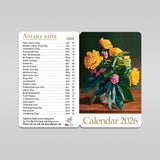 This useful single fold calendar fits easily inside your purse or wallet. It has a complete monthly calendar as well notable dates.